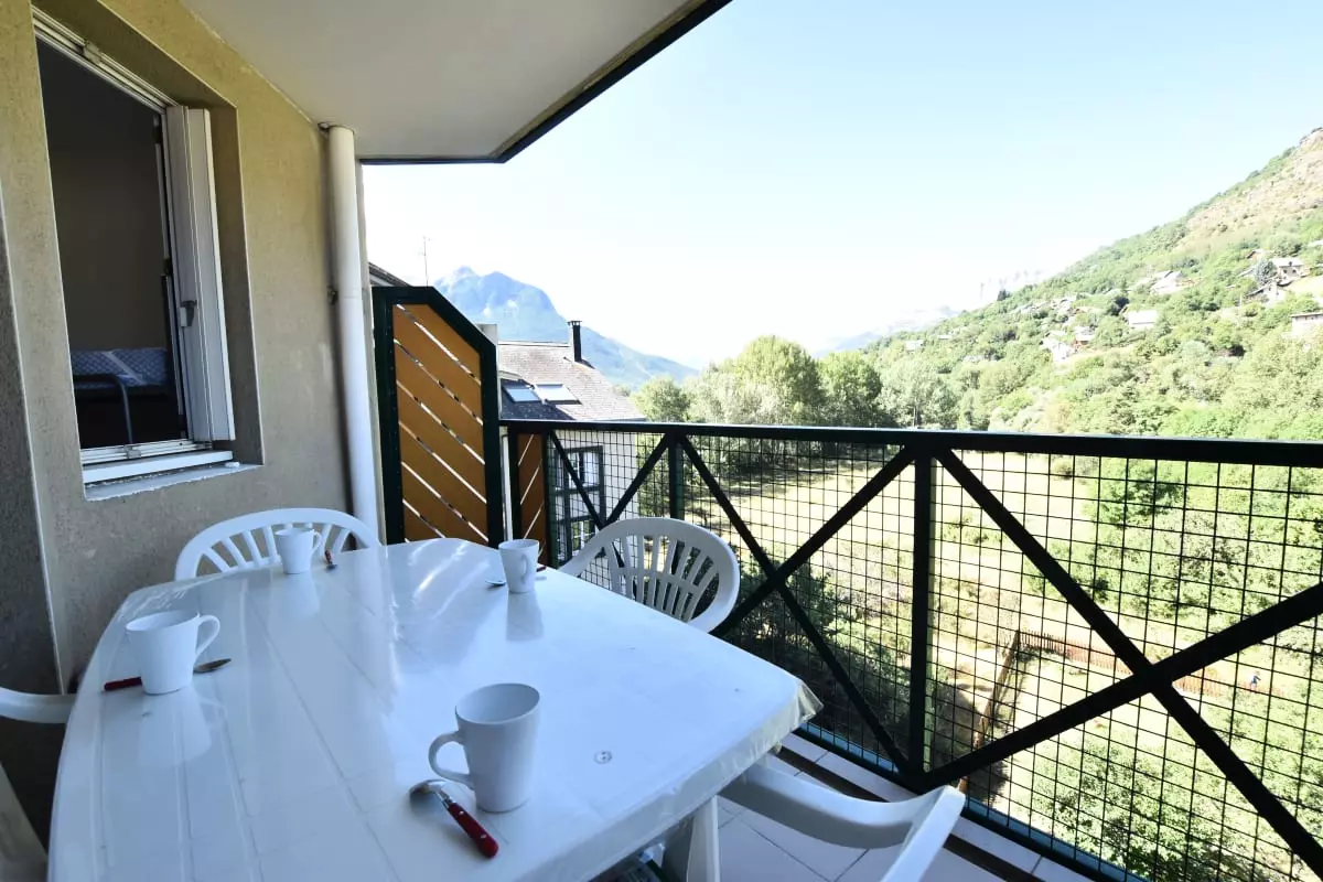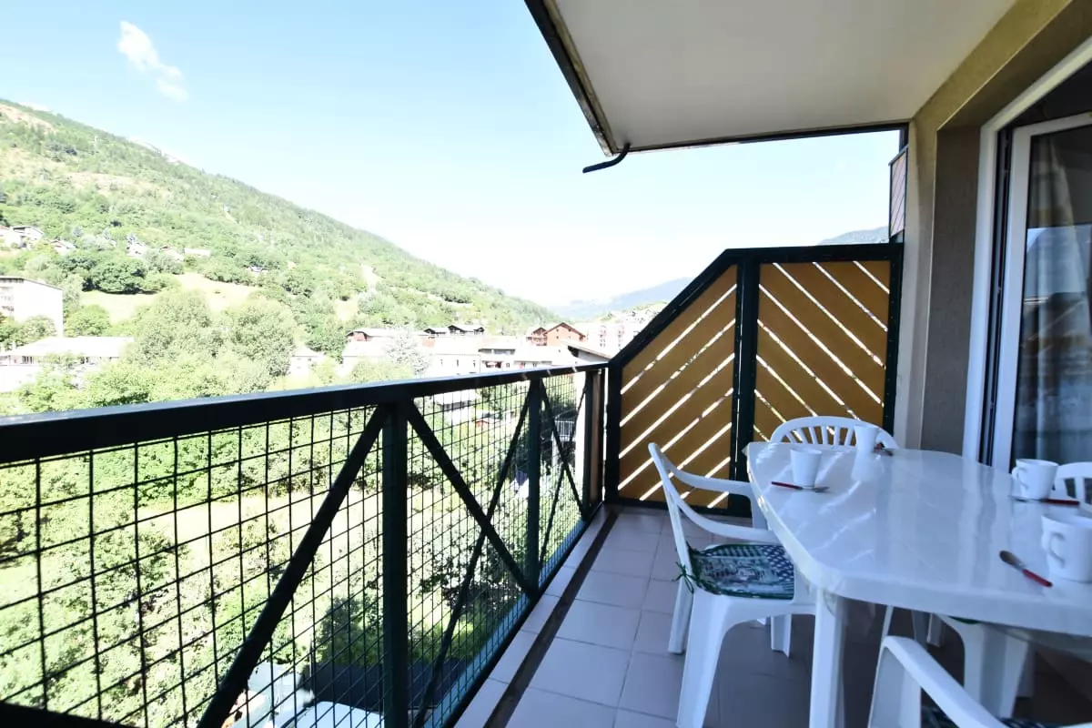 Le grand balcon est un véritable atout pour profiter du soleil et de la vue sur les sommets environnants, avec une table extérieure pour vos repas en plein air.